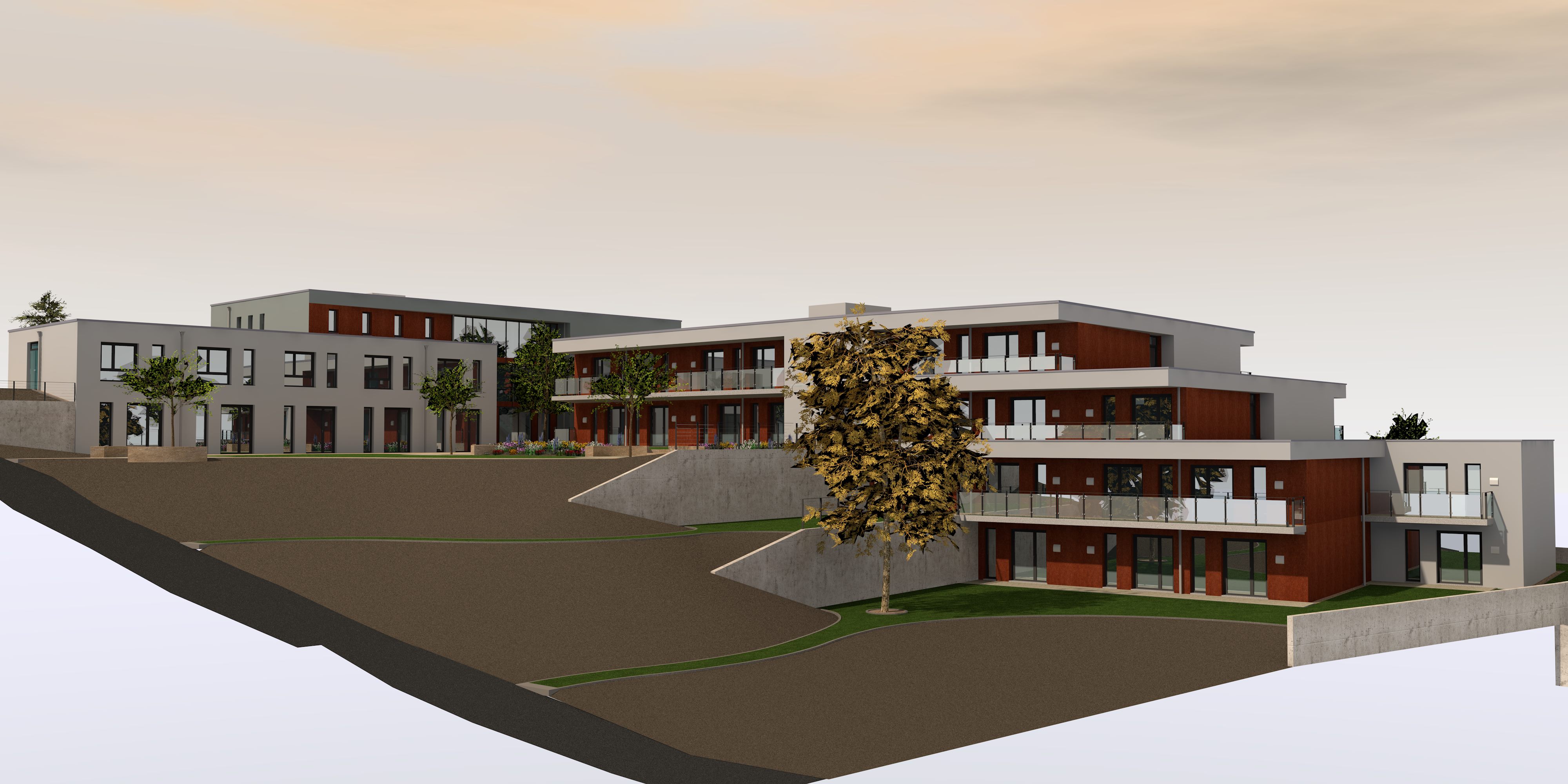 Auf einem 6.749 m² großem Grundstück plant Domizilium ein modernes und innovatives Wohn- und Pflegeangebot mit je 80 Wohn- und Pflegeplätzen sowie weiteren 30 stationären gerontopsychiatrischen Pflegeplätzen. Diese verteilen sich auf fünf weitgehend eigenständige Häuser, welche sich entlang eines südorientierten Hangs erstrecken. Ein gemeinsamer Gartenhof im Zentrum des Ensembles trennt und verbindet die Gebäude gleichermaßen und lädt zum Verweilen ein. So entsteht ein attraktives Quartier sowohl für die künftigen Bewohner als auch die für die Beschäftigten. Aktuell wird die Planung mit potentiellen Betreibern konkretisiert.